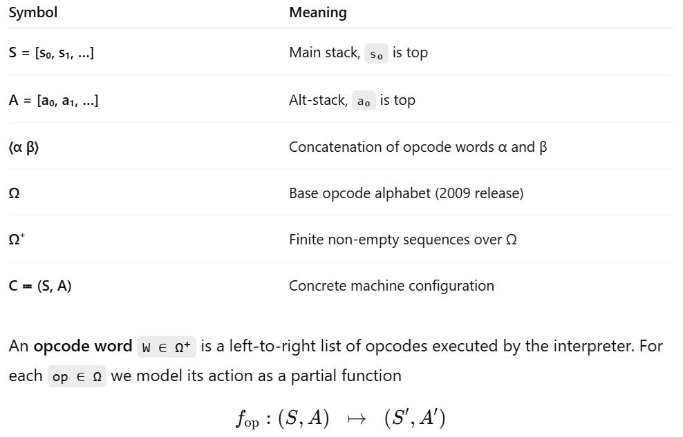 • Bitcoin Script’s main and alt stacks form a two-stack push-down automaton (2PDA), which is equivalent in power to a Turing machine when execution is statically bounded.