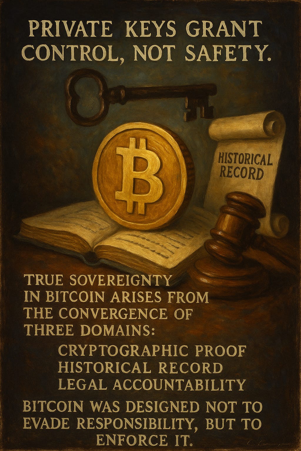 Private keys grant control, not safety. They authorise action but do not legitimise it; they open the vault but cannot guarantee what is inside was lawfully obtained. The mythology of Bitcoin has long confused power with authority, imagining that mathematics could replace the moral and institutional scaffolding of ownership. Yet control without recognition is brittle, and cryptographic possession without legal standing is a kind of self-imposed exile. The key alone secures access; only context secures legitimacy.
