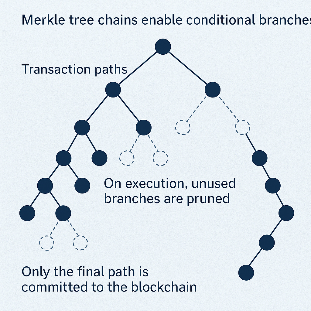 Unlike a Merkle tree, which encodes past data with fixed fan-out and binary branching, the transaction automaton is a non-binary, dynamically constructed conditional tree of future potentialities. Each branch corresponds to a predeclared but unexecuted transaction. Some branches may themselves spawn further sub-branches with their own script conditions, recursively.