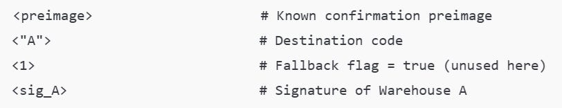 Suppose the distributor and 3PL mutually agree on Carrier B. The warehouse validates T₁_b, signs it, and constructs T₂, a terminal spend of the conditional UTXO to the retailer’s key, encoded as: