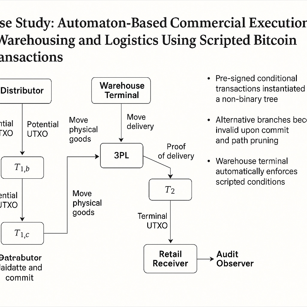 This model is not hypothetical. Every example — from layered supply chain predicates to multistage transaction graphs — demonstrates how commerce becomes a chain of conditionals, with execution governed by contract and state resolved only through validation. There are no trusted third parties. There is no middleware. Every actor, whether a warehouse scanner or ERP backend, becomes a validator node in a broader automaton whose global state is encoded in UTXOs, whose program logic is Script, and whose transitions are final.