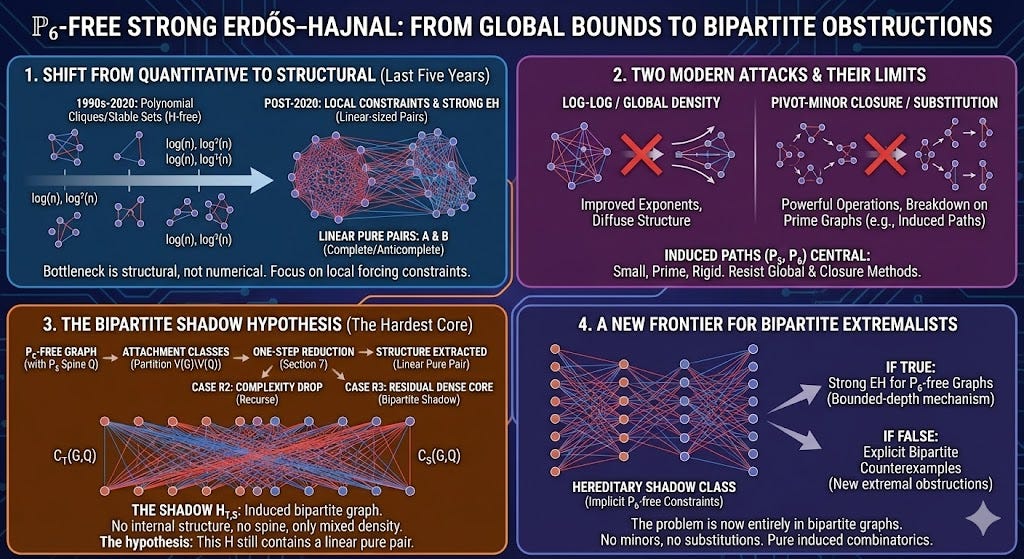In that sense, the bipartite shadow hypothesis is not a weakness of the paper. It is its organising achievement. It turns “strong Erdős–Hajnal for P₆-free graphs” from a vague global ambition into a concrete, local, hereditary problem whose resolution—positive or negative—would be mathematically meaningful.