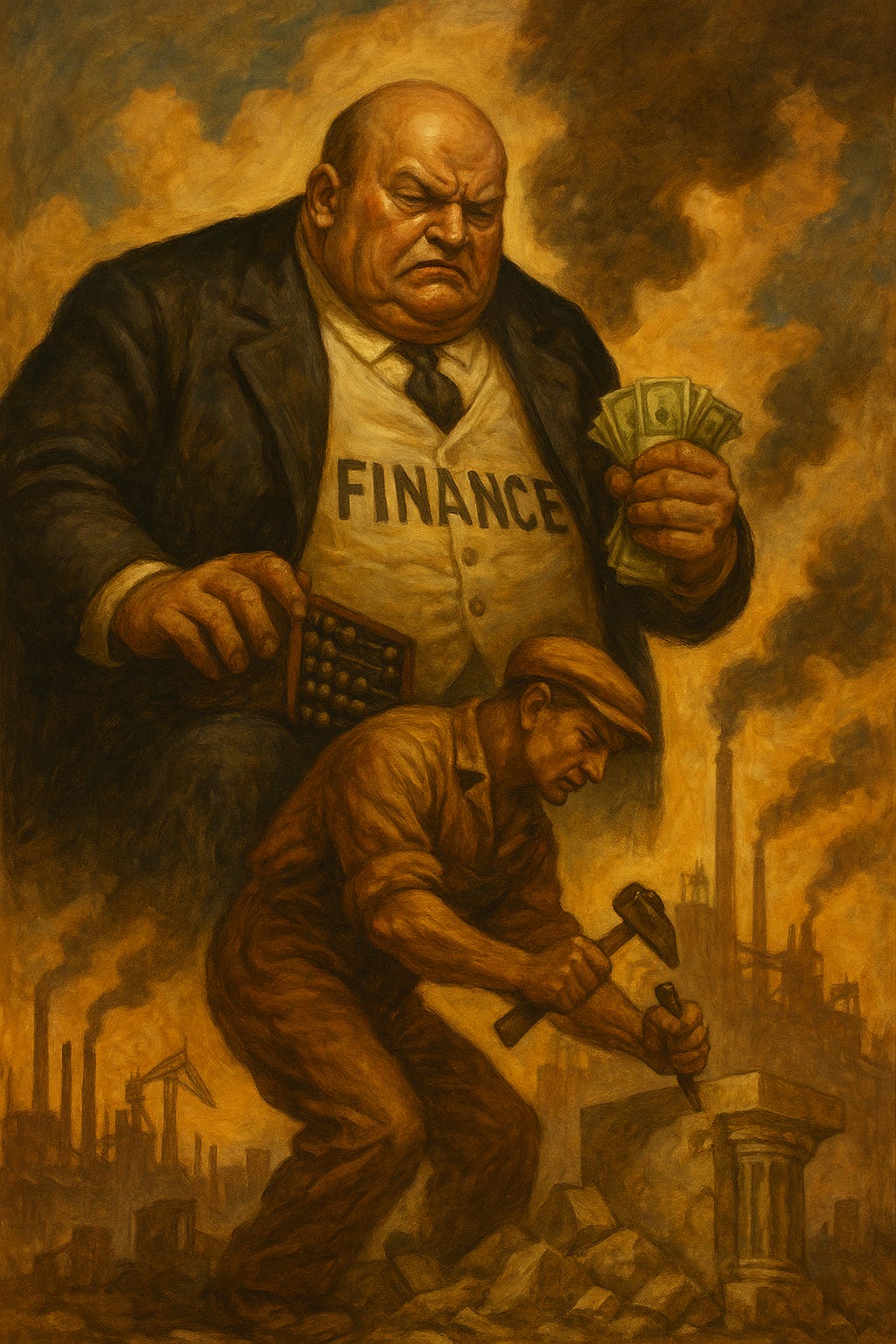 This is the era in which finance, once the servant, has enthroned itself as master. And like all usurpers, it consumes far more than it contributes, all while insisting—with operatic indignation—that civilisation would collapse without its benevolent stewardship. The truth is simpler and infinitely more damning: the world does not rely upon this great parasitic organism; it merely endures it, much as one endures a hereditary aristocracy or a fungal infection, hoping that one day the fever will break and sanity will return to a species born to create rather than to be fleeced.