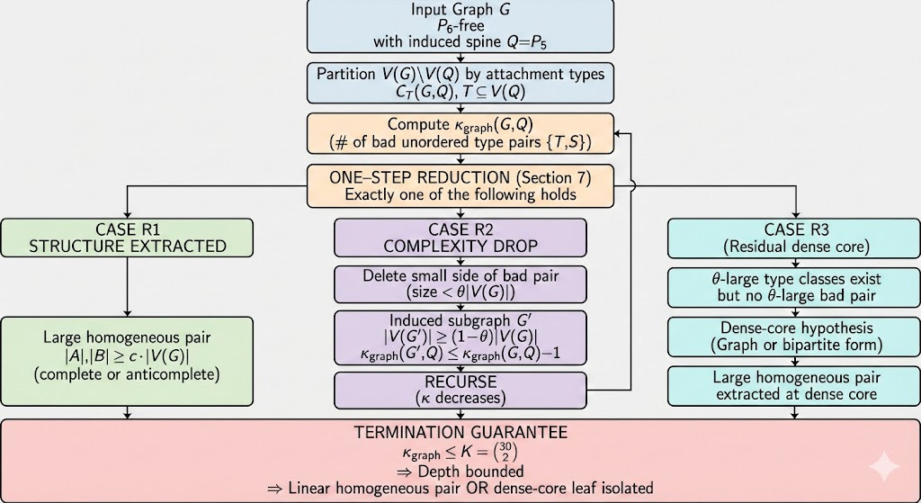 This post explains a mechanism that reduces the strong Erdős–Hajnal problem for P₆-free graphs to a single residual configuration — a dense mixed interaction that cannot be resolved locally. Everything else collapses mechanically.