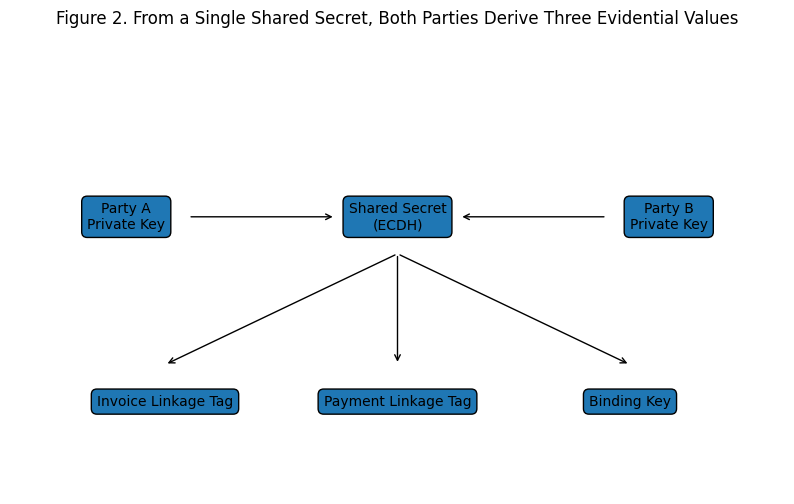 Figure 2. From a single shared secret, both parties derive three values: an invoice linkage tag, a payment linkage tag, and a binding key. Each serves a different evidential purpose.