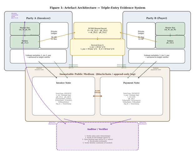 Figure 3. The full artefact architecture. Party A publishes an invoice note; Party B publishes a payment note. Both are linked through ECDH-derived tags and anchored on the immutable public medium. Auditors receive selective disclosure — field-level access, not blanket visibility.