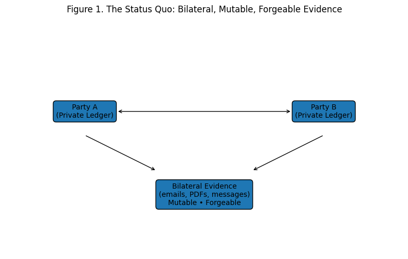 Figure 1. The status quo: each party keeps their own records. The evidence connecting them is bilateral, mutable, and forgeable.
