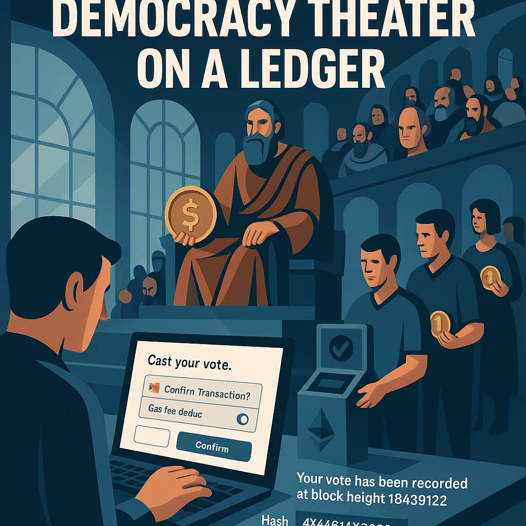 Enter the circus of tokenised governance: votes on-chain, ballots as NFTs, "quadratic voting" smart contracts. Slathered in the gloss of decentralisation, these systems pitch themselves as the future of democracy. But behind the jargon—DAO governance, on-chain quorum, gas-optimised ballots—is a hollow technical reality: they’re playgrounds for plutocrats, not platforms for citizens.